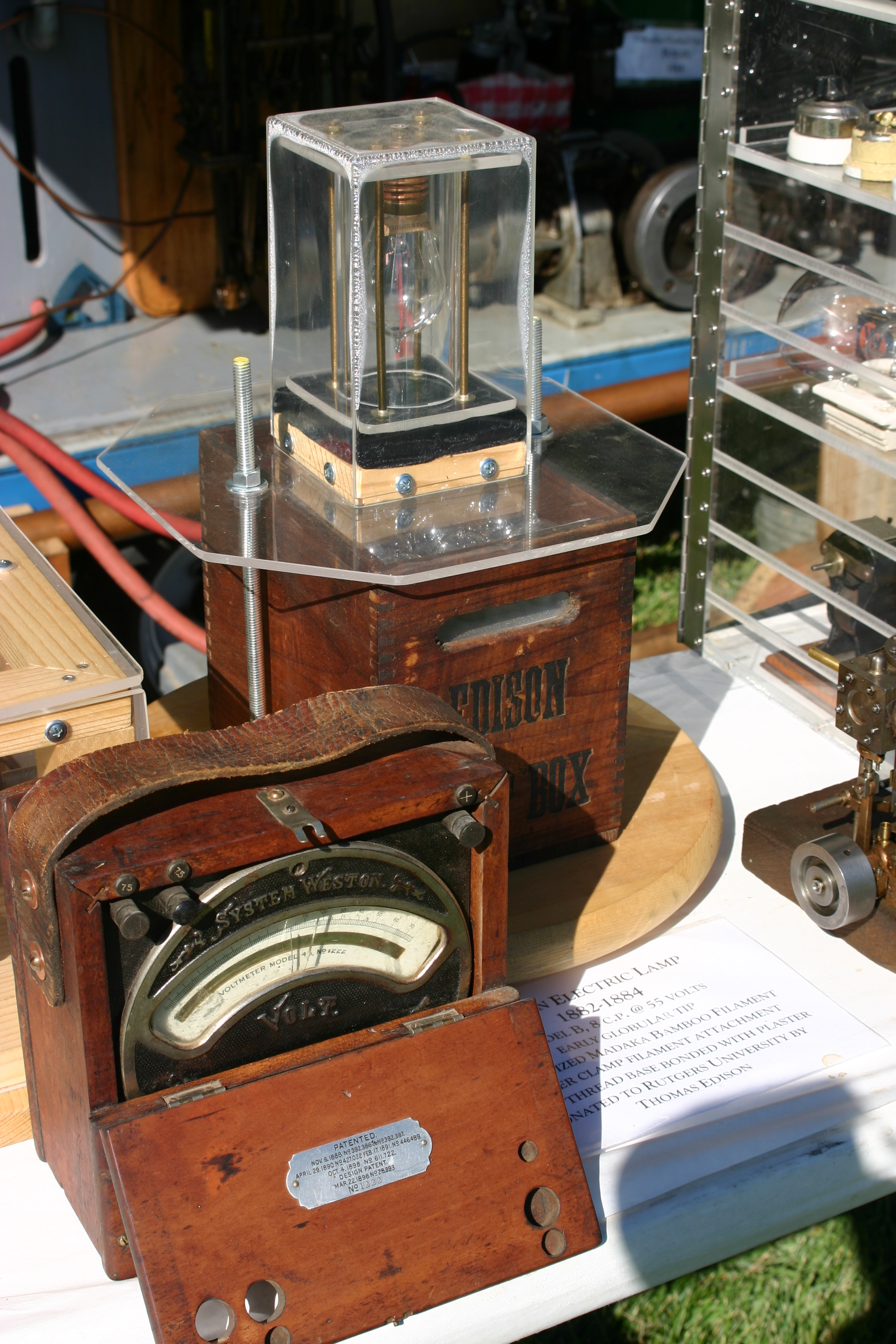 Original early Edison carbonized filament lamp, 1883; Edison lamp box, and Weston voltmeter patented 1888.